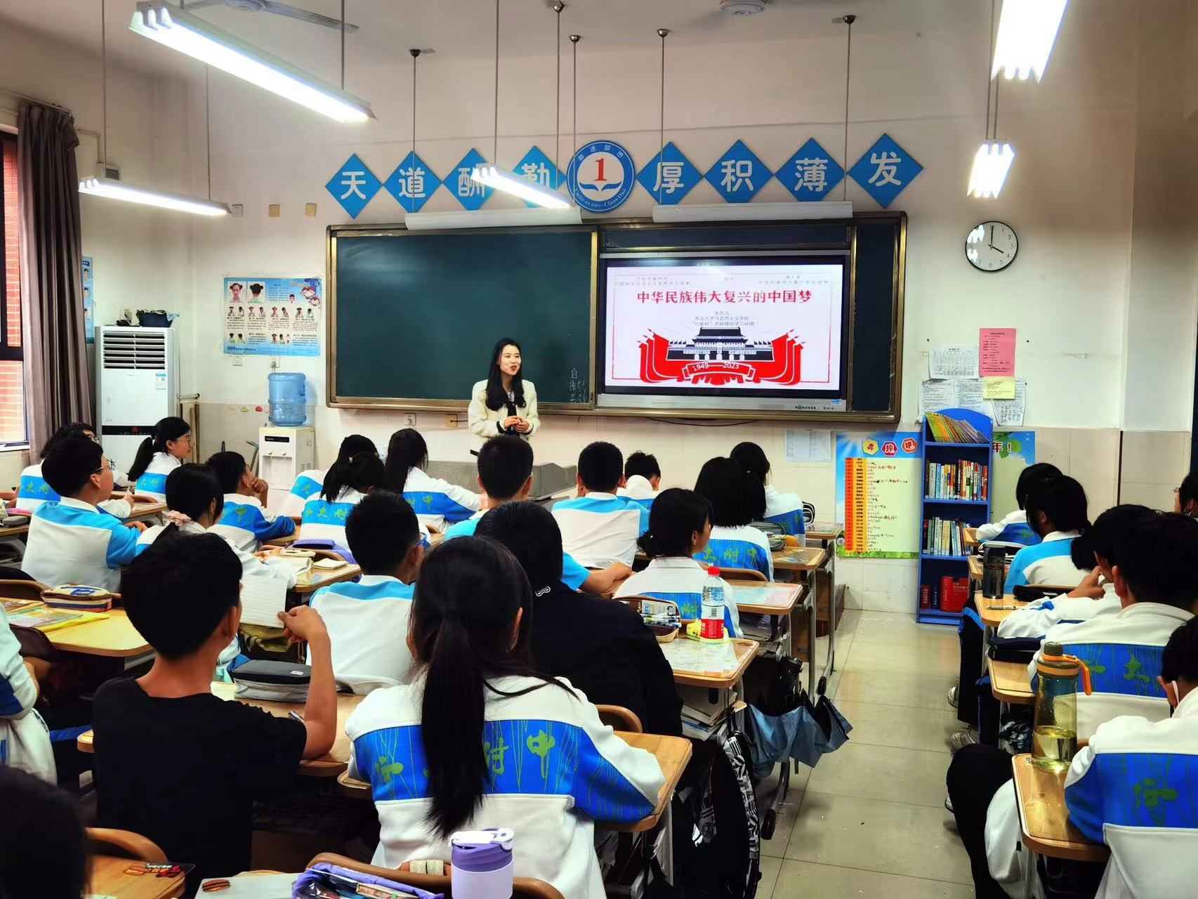 5月23日,我院“红桅杆”思政理论学习社团以《习近平新时代中国特色社会主义思想学生读本》为主要内容,在长安区西北大学附属初级中学为七年级同学开展思政课教育。本次活动的主讲人是来自21级中国近现代史基本问题研究专业的硕士研究生黄文馨和22级思想政治教育专业的硕士研究生张凡凡。