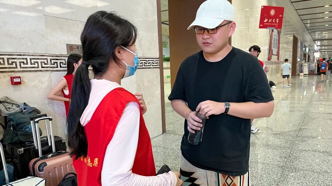 迎新志愿者们早早地等候在北门、南门以及迎新报到点等每一处新生可能需要帮助的地方:帮忙提随身行李,指引报到的方向,耐心解答各种疑问。在报到现场,志愿者们耐心地引导新生完成各项手续,细心地讲解注意事项。他们的耐心和细心,将“以家人之名”向新生们传递温暖与热情。