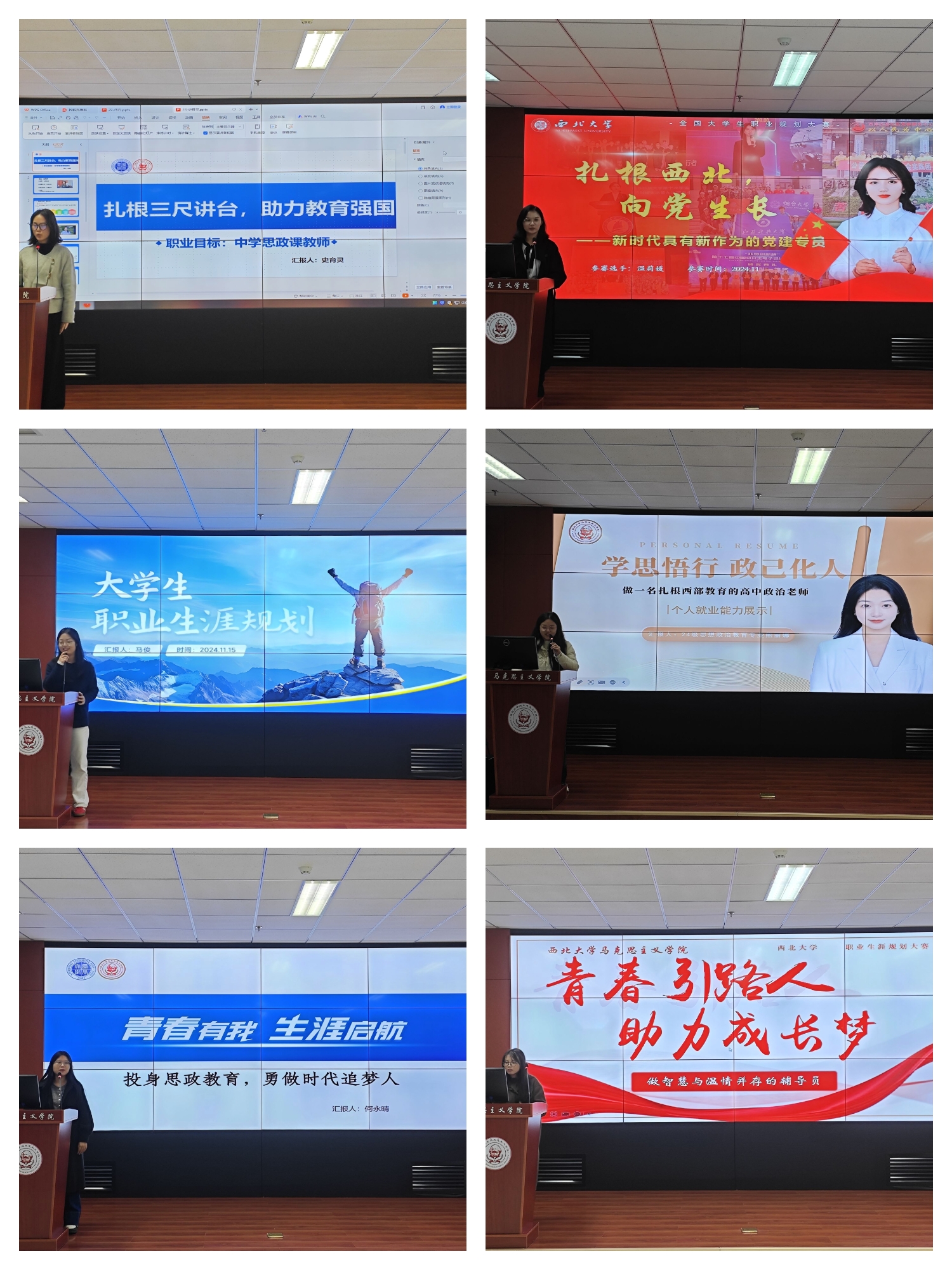 本次比赛将入围院级初赛的24名同学分为四组,每名参赛同学分别进行五分钟个人展示,汇报结束后由评委现场打分,最后由计分小组汇总。