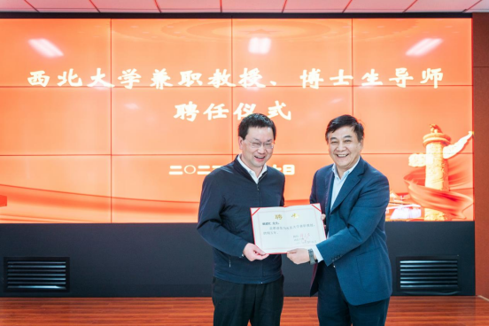 王亚杰(右)为姚建红颁发西北大学兼职教授聘书